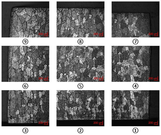 Among the mean grain sizes for each experiment setup, it can be observed that the mean grain size was obtained from experiment 3, which reaches the minimum as 207 μm, while experiment 9 can cause the maximum one in 246 μm. Furthermore, only experiment 9 can cause a mean grain size larger than that obtained from the incoming alloy. The remaining experiments only have smaller mean grain sizes. Among those experiments, the grain size in experiment 2 and 3 becomes smaller at all sampling positions. In view of the standard deviation, it can be further seen that experiment 1 has the largest standard deviation, 35 μm, which means that the sampling position in this case might significantly influence grain size. On the other hand, the standard deviation in experiment 2 is the smallest, only 13 μm, suggesting that this experiment setup might cause a relatively homogeneous distribution of grain size.