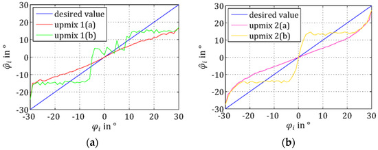 Panning test—angle of the virtual test sound sources compared with the determined virtual sound sources of the upmix algorithms: (a) algorithms upmix 1(a) and 1(b); (b) algorithms upmix 2(a) and 2(b).