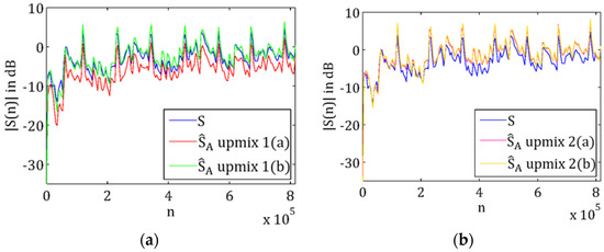 Direct signal test—remaining surround channel direct signal: (a) Algorithms upmix 1(a) and 1(b); (b) algorithms upmix 2(a) and 2(b). Note that the index in the plots represents discrete values of time. represents the magnitude of the respective complex direct signal averaged over all frequencies.