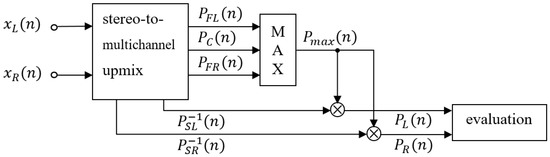 is calculated from the mean of the quotient of the spectral envelopes [13] and of the amounts of direct signals, across all times and frequencies, representing their relative deviation. To ensure a comparative evaluation, the summed power of the extracted surround channels must be equivalent to the summed power of the input signals. That is because signals before and after the upmixing process are considered. Only through using normalized surround signals is a comparative evaluation possible. This ensures, among others, that surround signals are considered correctly, which are identically equal to the input signals but reduced in power. That is because they would have the same relative amount of direct signal. The evaluation allows the comparison of the remaining surround channel direct signal with the known direct signal of the used test signal (see Figure 5).