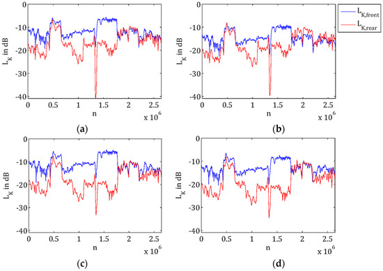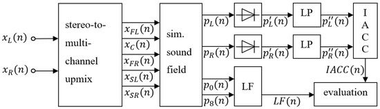The interaural cross-correlation coefficient (IACC) describes the subjectively perceived spatial quality of sound events, and is a measure for apparent source width (ASW). The lateral energy fraction (LF) describes the impression of spatial quality, and is also a measure for listener envelopment (LEV) [7,19,20]. For the determination of IACC, the generated upmix output signals , , , and are used to create a simulated sound field on the basis of head-related impulse responses (HRIR). The binaural signals: