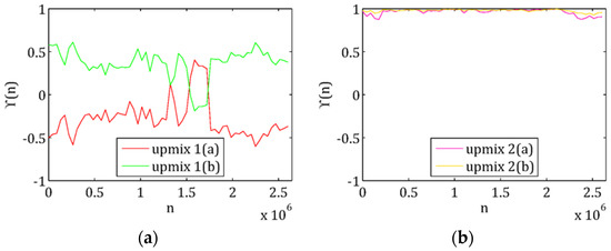 Correlation degree of surround channels: (a) Upmix 1(a) and 1(b); (b) upmix 2(a) and 2(b).