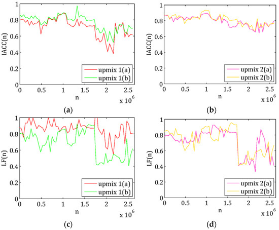 Perception test: (a) IACC for upmix 1(a) and 1(b); (b) IACC for upmix 2(a) and 2(b); (c) LF for upmix 1(a) and 1(b) IACC; (d) LF for upmix 2(a) and 2(b).