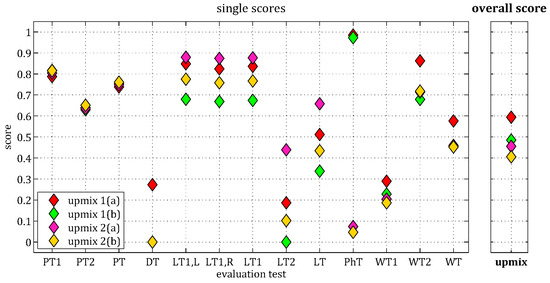 The higher a score, the better the test result. Zero is the worst, one the best evaluation score. Appropriate results should be visualized here based on two upmix algorithms available on the market with two modes for music (a) and movies (b) in each case. Hereinafter, they are denoted as upmix 1(a), 1(b), 2(a) and 2(b).