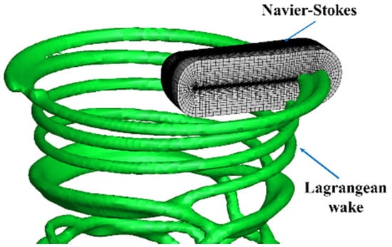 where is the position of the particle, is the vector-valued total vorticity inside the particle , , is the free stream velocity, and is the local induced velocity. In the right-hand side of Equation (3), the first term is the stretching-effect term and the velocity field is analytically differentiated to solve the velocity gradient. The second term is the viscous diffusion term, and the Particle Strength Exchange (PSE) method [26] is utilized for the solution.