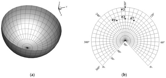 The observation locations in the numerical simulation, same with the microphones in the test condition, are distributed on a spherical surface, 3.44 R from the rotor hub, as seen in Figure 3a. The Lambert projection is applied for turning the acoustic radiation spherical arc into a plane for better observation, and Figure 3b shows the projection developed drawing.