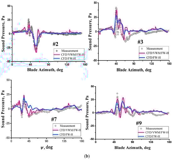 The contour plots of SPL on the 3.44 R hemi-spherical surface are shown in Figure 7a. As shown, the high noise level (acoustic “hotspot”) appears at 120° in azimuth and 45° below the rotor plane, implying that the typical BVI noise has strong directivity, approximately down and forward from the rotor. Figure 7b presents the predicted sound pressure distributions using the CFD/VWM/FW-H method at four observation locations (#2, #3, #7, #9). For comparison, the results of using the CFD/FW-H method are also included in the figures. BVI noise is found to dominate at #3, #7, and #9, and each noise signature consists of positive and negative impulses, which are respectively induced by interactions on the advancing side and the retreating side. We also observed that a large negative peak occurs at #2, attributed to the blade thickness noise mechanisms. Compared with the CFD/FW-H method, the hybrid method is found to better predict the noise peak in amplitude and phase, because the rotor wake simulation is more accurate, which demonstrates its capability for favorable accuracy. Moreover, Table 3 illustrates the comparison of the computation time between the two methods. As shown, about 148 h and 21 h are required, respectively, further demonstrating the developed method to have high computation efficiency.