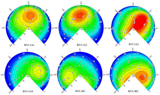 Peak noise level contours for six BVIs on the sphere surface.