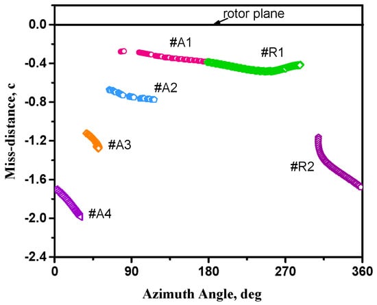 During descent flight, specific BVI events are observed at several azimuth angles. Utilizing the blade and tip vortex geometry equations in Sim et al.’s research [27], we can capture the BVI loci. Figure 5 shows the locations of BVI events and the lift distribution on the rotor disk. Six BVI events are identified in Figure 5a, of which four on the advancing side are marked as: #A1, #A2, #A3, #A4, and the other two on the retreating side are marked as: #R1, #R2. Figure 5b shows that complicated lift fluctuations occur near the locations of BVI events. According to the relative position between the blade and the vortex filament, the interactions #A3 and #R2 in the outer part of the blade are referred to as parallel interactions, because each blade’s leading edge is nearly parallel to the vortex filament, while others are referred to as oblique interactions. Figure 6 presents the miss-distance, which varies with the azimuth angle on the axial plane, and the interaction strength of BVI depends on both the interaction angle and the miss-distance.