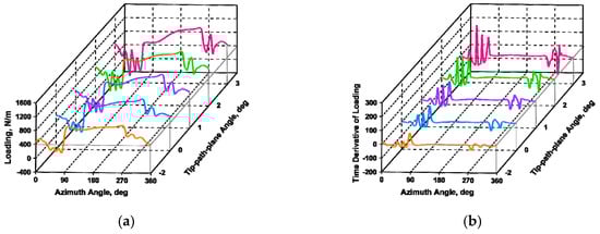 Sectional airload variance with the tip-path-plane angle at 0.9 R. (a) Loading; (b) Time derivative of loading.