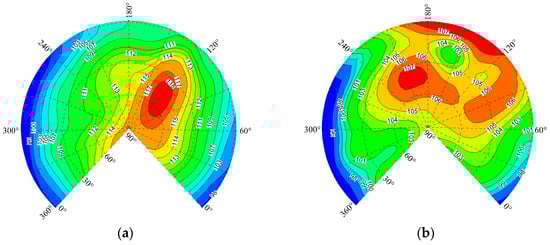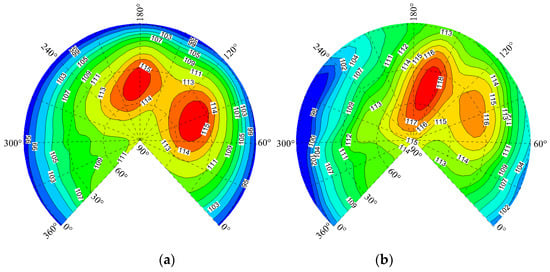 Contour plots of SPL on the sphere surface for different advance ratios. (a) ; (b) .
