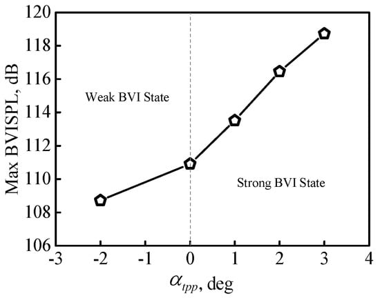 The effects of tip-path-plane angle on the peak BVI noise level are correspondingly shown in Figure 13. When the rotor disk is tilted forward, the peak noise level changes slowly with because the rotational noise dominates the acoustic field. However, when the rotor disk is tilted backward, BVI occurs and the peak noise level changes quickly with . This indicates that the tip-path-plane angle has more influence in the BVI state but less influence in the non-BVI state.
