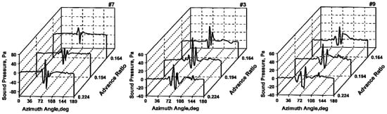 Figure 22 presents the impact of the advance ratio on the predicted sound pressure at #7, #3, and #9. As #7 is located between the noise level peaks from interactions #A2 and #A3, a negative impulse from #A3 dominates the sound pressure signature at . With increasing , the impulse characteristics increase because interaction #A2 changes to a parallel interaction. However, at the same time the noise radiation direction will move down the rotor disk (Figure 23), which is why the sound pressure at #3 and #9 reach their maximum values at rather than . The conclusion we have drawn from these analyses is that the sound pressure signature at one observation location is closely associated with the dominant interaction in BVI, which generates stronger impulse noise.