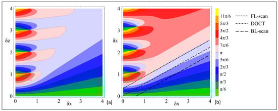 Contour plots of the numerically calculated phase shift Δϕ between consecutive A-scans as a function of the normalized transverse δx and axial δz displacement of the oblique sample motion [,] for detector dead times ΔT/TA-scan of (a) 0.0 and (b) 0.05. The central dashed line with ϑ′ of 29° corresponds to the expected phase shift of the 1% Intralipid flow experiment presented in Section 4. Additional shifted dashed lines with ϑ′ of 29° are given for the LR-scanning explained in Section 2.2.