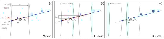 Since the phase-resolved Doppler measurements in SD-OCT are limited for strong transverse components and high sample velocities, the transverse tracking of the obliquely moving sample is proposed in this research and defined as lateral resonant scanning. With this, the impact of the transverse motion component on the Doppler phase shift can be theoretically reduced. For a better comprehension of the subsequent experimental results, a simple geometric model is defined on the basis of Figure 2 for the Doppler measurement in SD-OCT. As shown, a Gaussian sample beam and an oblique sample motion with an arbitrary Doppler angle ϑ are assumed. In this case, a group of scattering particles is supposed to be seen at the end of the detection intervals, [T1, T1 + TInt], [T2, T2 + TInt], and [T3, T3 + TInt], of three consecutive A-scans, where the respective position of the particles is shown by three blue distances and labeled with I, II, and III. Three cases of Doppler measurement performance are drawn in Figure 2: (a) with a static sample beam, resulting in a conventional M-scan (time-resolved A-scan); (b) with a laterally moving sample beam in the direction of the sample movement, resulting in a so-called forward lateral scan (FL-scan); and (c) with lateral scanning in the opposite direction, so-called backward lateral scan (BL-scan). Case (a) corresponds to the common phase-resolved Doppler measurement without imaging, where the sample beam of the OCT system is static to guarantee the highest phase correlation between adjacent A-scans. Due to the limited Gaussian sample beam, the group of particles seen in the time interval [T1, T1 + TInt] are only partly detectable in the subsequent time interval [T2, T2 + TInt] (shown by the red dotted lines), for which reason the measured axial displacement Δzd and Δϕ are reduced, especially for small Doppler angles and large transverse displacements [,,].