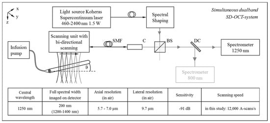 Dualband SD-OCT system, where the long wavelength band centered at 1250 nm with a full spectral width of 200 nm is used with a fiber-coupled customized scanning unit. Abbreviations: SMF: single mode fiber, C: collimator, BS: beam splitter, DC: dichroic mirror, ϑ: Doppler angle. The flow phantom consists of a 312 µm glass capillary connected to an infusion pump by a tubing system and filled with 1% Intralipid and diluted fresh human blood, respectively.