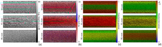 The visual assessment of the Doppler images in Figure 6b suggests a high noise of the Doppler phase shift at the capillary center in the M-scan, at the capillary border in the FL-scan, and over the entire capillary lumen in the BL-scan, which is caused by the reduced correlation of adjacent A-scans. As predicted in Section 2.2, the phase-sensitive image of the BL-scan visually shows the highest noise of the Doppler phase shift. For the quantification of the phase correlation, the correlation quotient CQ, defined in former research [,], is calculated as a function of z and is overlaid in color on the structural images, as presented in Figure 6c. CQ is shown in red for the highest correlation between consecutive A-scans. The results of CQ prove the suggestions made by the observed speckle patterns in Figure 6a and the estimated phase shift noise in Figure 6b. Additionally, the standard deviation of the mean Doppler phase shift is given in Figure 6d. As described in previous studies [,,], the distribution of Δϕ cannot be worse than isotropic in the original interval of [−π, π], resulting in an upper limit of π/√3, as shown by the red color of the σΔϕ scale bar. By means of the colored structural information for visualizing Δϕ, CQ, and σΔϕ, the possibility to laterally track the flowing oil particles with a simultaneous decrease of the phase shift noise for small Doppler angles and high flow velocities, becomes apparent.