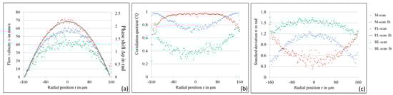 (a) Calculated and fitted flow profiles of the flowing 1% Intralipid as a function of the radial position r inside the 312 µm capillary for the M-scan (blue points), the forward (FL-scan, red points) and backward lateral scan (BL-scan, green points). Additionally, the correlation quotient CQ (b) and the standard deviation σΔϕ (c) are shown versus r for the detected M-scan, the FL-scan and the BL-scan.