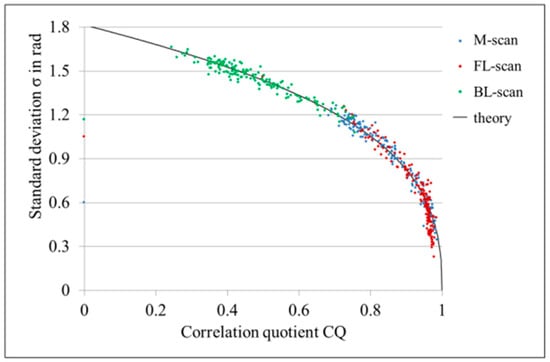 Mean error (standard deviation) σΔϕ is shown theoretically (solid line []) and experimentally (measurement points of the M-scan, FL-scan, and BL-scan) as a function of CQ.