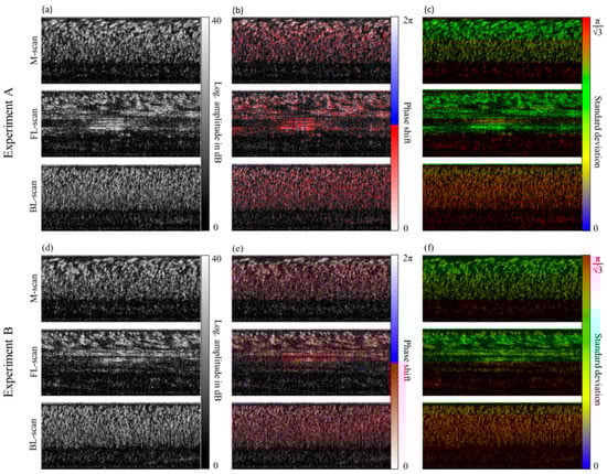 Grayscale structural images (a,d) and phase-resolved Doppler images (b,e) are shown of the M-scans, FL-scans, and BL-scans each consisting of 400 A-scans for two experiments A and B with identical settings. In addition, the standard deviation of the mean Doppler phase shift of 400 A-scans is overlaid to the structural image for both experiments (c,f).