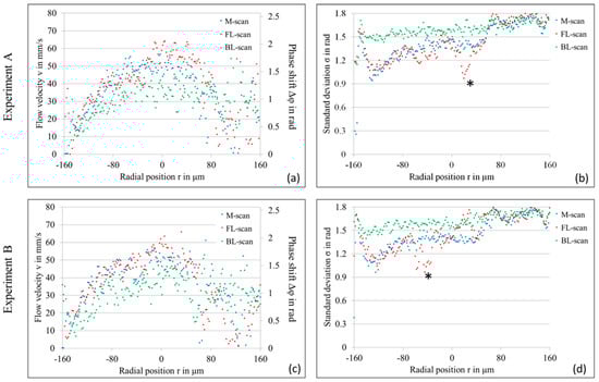 The mean Doppler phase shift and the corresponding standard deviation of the diluted human blood flow are quantified for both experiments, and the results are presented in Figure 10. As seen, both measurements offer similar characteristics, which show the reproducibility of LR-DOCT. Moreover, the calculated phase shift is slightly higher for the FL-scan than for the M-scan in the depth range of resonantly detected erythrocytes. Additionally, the standard deviation of the mean phase shift is reduced (asterisk in Figure 10b,d) at the radial position r near the center of the capillary. Since the erythrocytes are not completely resonantly detected over the detected 400 A-scans, Δϕ and σΔϕ include the phase information of parts with no significant backscattering signal, which unfortunately increases σΔϕ.