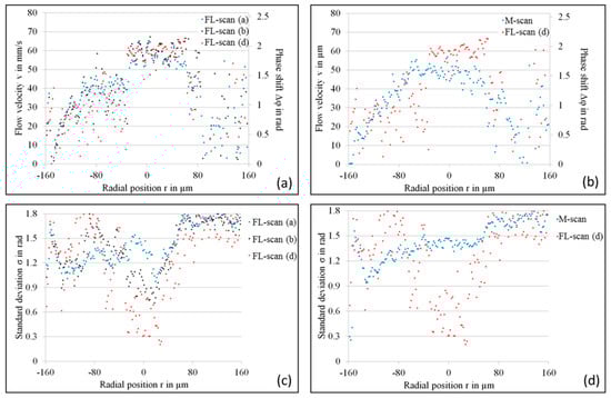(a) Calculated Doppler phase shift of the FL-scans in Figure 11a,b,d are shown as a function of the radial position r. (b) Doppler phase shift of the FL-scan in Figure 11d in comparison to the phase shift of the M-scan in Figure 9b. (c,d) Corresponding standard deviation of the mean Doppler phase shift presented in (a,b).