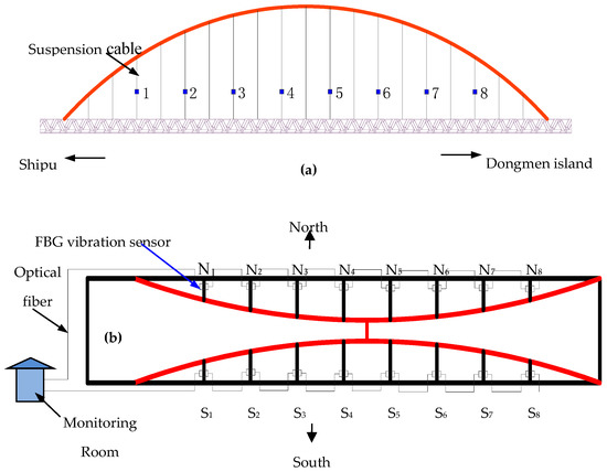 Arrangement of fiber Bragg grating (FBG) vibration sensors on Tongwamen bridge cables: (a) Side view; (b) Overhead view.