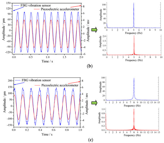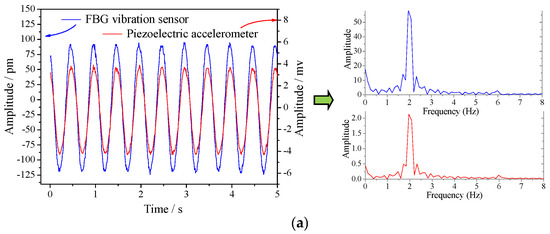To verify the applicability of the proposed FBG vibration sensor, a contrast experiment has been carried out. A FBG vibration sensor and a ‘B & K 4371’ piezoelectric accelerometer have been fixed together on the exciter and applied by a sine excitation signal with different frequencies of 2, 5, and 8 Hz, respectively. Figure 4 shows the contrast of the two sensors in responses of time-domain waveforms and frequency spectrums under different excitation signal. From the comparison charts, it can be seen that the FBG vibration sensor is consistent with the piezoelectric accelerometer, which demonstrates the applicability of the proposed sensor.