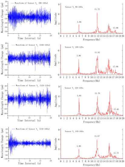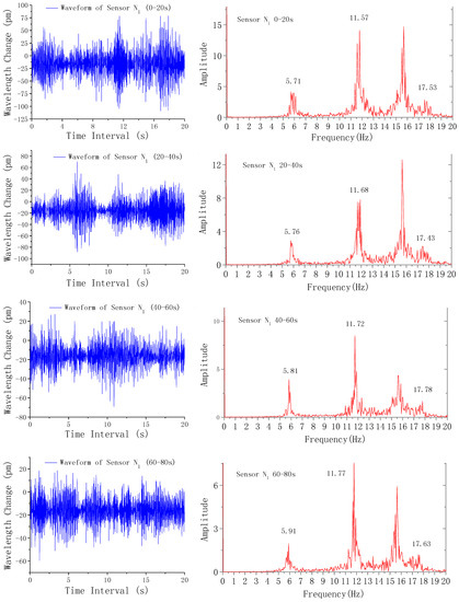 Sensor arrays on each side were composed of eight vibration sensors with a wavelength interval of three nanometers. Then, sensors on north and south sides were connected into the FBG demodulator through a single-mode optical fiber. The wavelength sampling precision of the demodulator was three picometers and sampling frequency was set as 200 Hz. Given the larger number of sensors and large volume of real-time collected data, here, monitoring data collected for 160 s from the first vibration sensor (Sensor N1) on the north side of the bridge is used as an example. Figure 6 shows the time-domain waveform of sensor N1 for 160 s. To facilitate measurement of fundamental cable frequency, every 20 s in a time span of 160 s was taken as a measurement time unit. Then, frequency spectrum within this time period was acquired using fast Fourier transform (FFT). Figure 7 and Figure 8 show time-domain waveform and frequency-domain spectrum for each 20 s. Taking the 0–20 s data in Figure 7 as an example, the fundamental frequency of the cable is obtained as 5.71 Hz and multiplier frequencies are 11.57 Hz and 17.53 Hz, and the resonant frequency of the sensor is 15.5 Hz. Results from the other time periods are the same. Therefore, it can be concluded the that vibration frequency of the cable can be successfully measured by the sensor.
