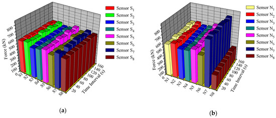 For the 3rd cable, where sensor N1 was located, effective length and weight are 19.502 m and 218 kg, so linear density is 218/19.502 = 11.178 kg/m. Then, the corresponding terms in Equation (1) are: m = 11.178 kg/m, l = 19.502 m, fundamental frequency fn within 0–20 s is 5.71 Hz, for n = 1, and cable force can be obtained as T = 554.44 kN. Forces in remaining time units for sensor N1 can be calculated similarly. By this method, cable forces measured by all 16 sensors can be obtained. In addition, measurement results can be influenced by wind or gusts because wind load will cause whole-body vibration of the bridge. This whole-body vibration has an influence on the sensor measurements. However, compared with cables, the whole-body vibration frequency is usually much lower than the fundamental frequency of cables, so fundamental frequency measurement will not be affected. When environmental temperature changes, the amplitude of the vibration waveform changes correspondingly, whereas the frequency of the vibration waveform after FFT still remains unchanged. So, vibration sensors for frequency measurement do not need temperature compensation. Figure 9a,b shows the dynamic force distribution over time for all 16 cables on south and north sides, respectively. As can be seen, for most cables, forces were around 550 kN. However, measured forces on the 15th and 17th cables on north side with sensors N7 and N8 were found to be abnormal. The average force of the 15th cable was 780 kN, which exceeds the normal value of 550 kN, whereas the force of the 17th cable was only 250 kN. From these two cables, it can be concluded that they are in a critical state and in urgent need for maintenance and repairs. Monitoring results have been reported to the bridge management department, and were taken seriously. Current monitoring results can provide accurate data for making scientific decisions on further safe operation and maintenance of the bridge. In addition, if an independent measure like magnetic flux method or piezoelectric acceleration sensor measurement is carried out to measure the cable force, a comparison of the two measuring results would be significant. However, we did not perform this during the project implementation about half a year ago, which is an oversight of our work.