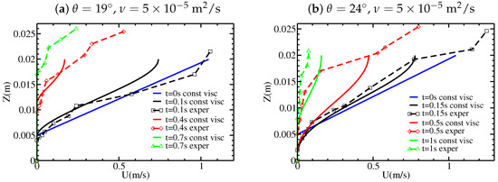 Velocity profiles at different times, for variable viscosity associated with the law, with linear initial velocity profile and slope angles and . The experimental results from Figure 3 are shown for comparison.