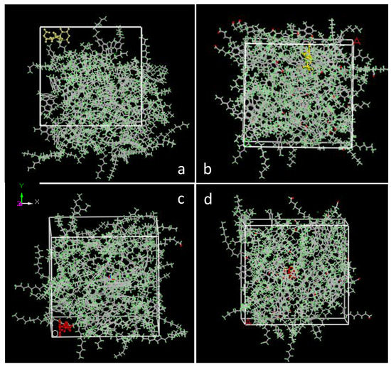 The simulation process of diffusion coefficients mainly includes two parts: energy minimization and a dynamic simulation process. After energy optimization, a canonical ensemble (NVT) and an isobaric–isothermal ensemble (NPT) were simultaneously applied for the first 50 picoseconds (ps) to ensure a density stable system [26]. NVT is a statistical ensemble that represents the possible states of a mechanical system in thermal equilibrium with a heat bath at a fixed temperature [27]. The system can exchange energy with the heat bath, so the states of diffusion system will differ in total energy. NPT is a statistical mechanical ensemble that maintains a constant temperature and a constant applied pressure [28].