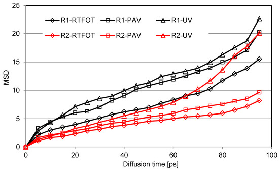 The diffusion coefficients and diffusion mechanisms in R-1- and R-2-treated RTFOT, PAV, and UV aged asphalt were modeled and studied. The molecular dynamic simulation of the diffusion process can be investigated by recording the movement locus of the molecular particles. The mean squared displacement (MSD) of the analyzed particles can therefore be finalized by means of this movement.