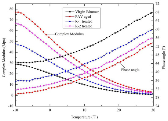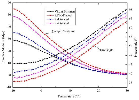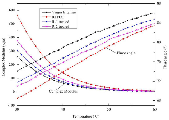 Furthermore, Figure 3, Figure 4, Figure 5, Figure 6, Figure 7 and Figure 8 illustrate that the curve of aged bitumen treated with R-1 in the lower temperature range is closer to the curve of virgin bitumen than that in the higher temperature range. This indicates that the recovery capacity of R-1 on the lower temperature behavior is more significant than that on the higher temperature behavior. Figure 3, Figure 4, Figure 5, Figure 6, Figure 7 and Figure 8 also show that the distinction between regenerative capacity of R-1 and R-2 is more obvious on the lower temperature properties than that on the higher temperature properties.