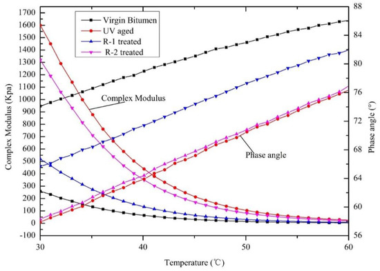 The dynamic shear rheometer (DSR) (Anton Paar, Graz, Austria) is usually used to characterize both viscous and elastic behaviors of bitumen by measuring the complex shear modulus and phase angle. A temperature sweep test was conducted. A sinusoidal signal of stress was applied. The complex shear modulus represents the sample’s total resistance to the applied deformation during sinusoidal stress conditions. Phase angle is described as the lag between applied shear stress and the resulting shear strain. The higher the complex shear modulus value, the stiffer the bitumen binder is. The larger the measured phase angle, the more viscous the binder is [29]. The temperature sweep test was performed at a fixed frequency of 10 rad/s and in temperature ranges from −10 to 60 °C with temperature increments of 2 °C per minute.