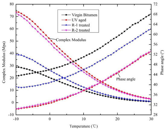 Figure 6, Figure 7 and Figure 8 present the complex shear modulus and phase angle at lower temperatures of virgin bitumen, RTFOT (or PAV, or UV) aged bitumen, and rejuvenator-treated bitumen. The complex shear modulus of aged bitumen is higher than that of virgin bitumen. We all know that aged bitumen is very brittle and easily cracks under loading at low temperature. The addition of R-1 and R-2 can also decrease the complex shear modulus and increase the phase angle at lower temperatures. This does mean, however, that both R-1 and R-2 can significantly improve low-temperature properties of RTFOT aged bitumen and extend the service life of bitumen in a lower temperature condition. The modulus curve of aged bitumen treated with R-1 is closer to the curve of virgin bitumen, while the curve of aged bitumen treated with R-2 is closer to the curve of aged bitumen. This phenomenon indicates once again that R-1 has a stronger recovery capability of lower temperature behavior of aged bitumen than does R-2.