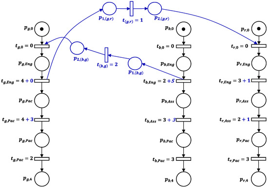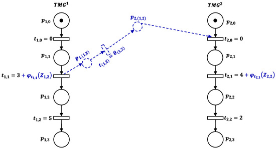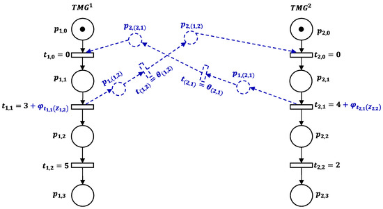The decomposed is determined as shown in Figure 4. It includes the direct arcs that schedule the possible processing sequences (Step 3). For instance, the timed direct arc ensures the processing of before through the value of . Besides, to avoid that the jobs conflict, a waiting time (Step 4) is added to corresponding transitions. For example, represents the time delay of at machine whether is unavailable for maintenance.