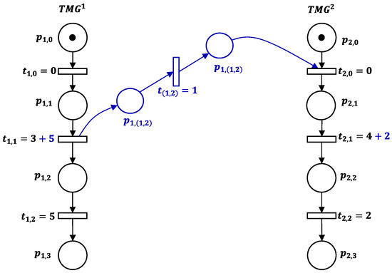 It is obvious that a timed direct arc between two transitions contains , , places and transitions. In the following, we consider .