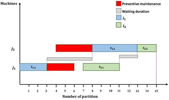 In order to illustrate the proposed decomposition methodology, we consider an composed of two machines operating two different jobs . The processing time of jobs () and the preventive maintenance periods () are respectively illustrated by Table 1 and Table 2.