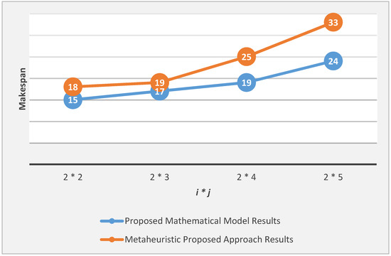 The effectiveness of the genetic algorithm is tested by evaluating the makespan computed with that determined by the mathematical model (through the Xpress optimizer). In order to make the comparison, we have computed the makespan for two machines as a function of the job number (Figure 13).