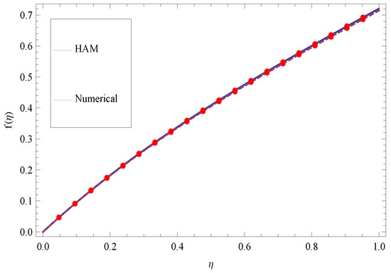 The comparison between HAM and numerical solutions for velocity profile , when h = −0.25, and .