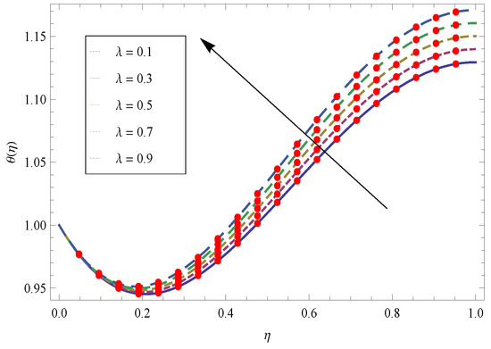 - The larger values of transport more fluid in the boundary layer region and cooling effect is produced which absorbed the heat transfer from the sheet and as a result the temperature reduces.