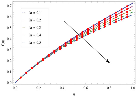 - Higher values of Porosity parameter generate larger open space and create hurdle to flow and as a result the flow field reduces.