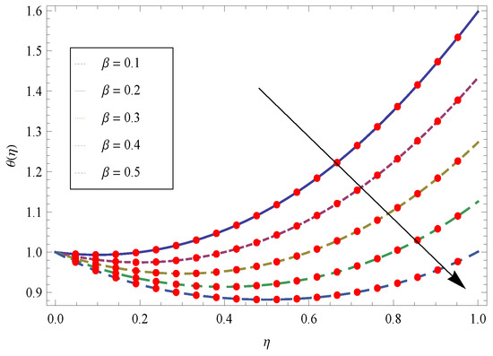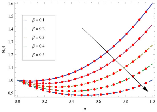 - The larger values of Prandtl number reduces the thermal boundary layer due to which the temperature field reduces.