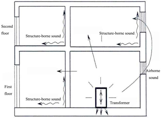 The main source of the transformer’s body noise is from the core and winding vibration [1,2,3,4,5,6]. The total vibration level on the transformer could be adequately described by the first few harmonics of 100 Hz [7]. Whereas the airborne sound output of transformers is not tremendously high, the vibration and subsequent structure-borne noise can be extreme. The reflection of solid-borne sound in walls and floors of buildings increases the energy density greatly [8]. For the most part, the transmission loss of the concrete floors is more than sufficient in attenuating airborne sound but structure-borne sound can be carried throughout the floors below for large distances from the transformer location [8], and then through beams, bricks, and walls to the rooms, thus resulting in more and more complaints from residents. The structure-borne sound and airborne sound transmission paths are shown in Figure 1. In view of this problem, it is difficult to adopt traditional sound insulation, muffler or sound control measures to achieve the desired results. Building engineers and consultants address airborne noise problems more effectively and confidently than structure-borne noise problems [9].