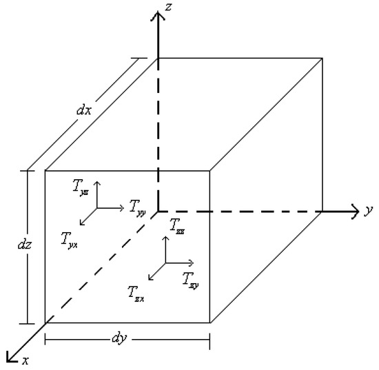 Analyze the movement of the small body element in the x direction separately in Figure 3. A similar analysis can be performed for the y and z direction. The external force that the small body element suffers in x direction can be divided into a normal stress perpendicular to the x-axis and a tangential stress perpendicular to the y-axis and z-axis.