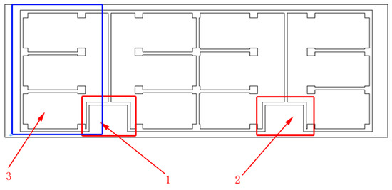 Schematic of the residence floor. Red box 1 and red box 2 represent the positions of the elevator and the door; blue box 3 represent a household, including three rooms.