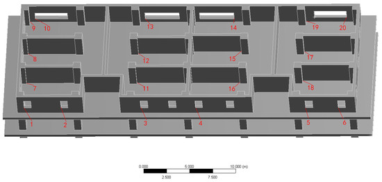 For the two-layer model, there are 20 probes set in Figure 9. The vibration response spectrum and displacement nephogram of each point can be extracted after simulation. Monitored points are generally located near the windows or the walls in that furniture such as tables, chairs and beds are usually placed closer to the wall, rather than the central area of the room, which meets people’s living habits.
