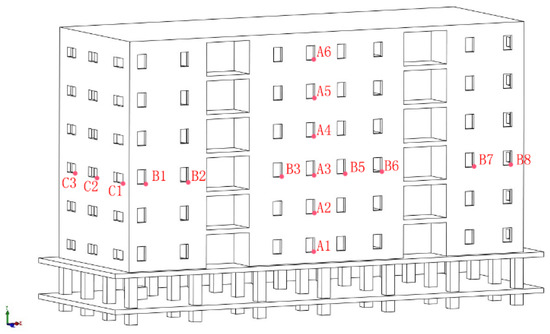 The location of the external monitoring points in six-layer model. A1–A6 are six monitoring points of vertical direction of the building; B1–B8 are eight monitoring points of horizontal direction of the building; C1–C3 are three monitoring points of the longitudinal direction of the building.