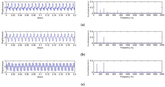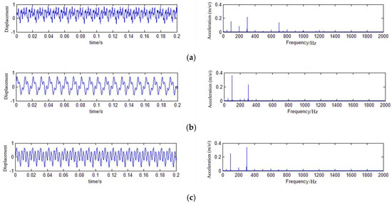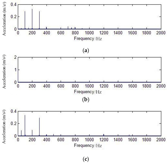 Acceleration spectrum of the transformer’s vibration: (a) No-load; (b) Short-circuit; (c) Load.